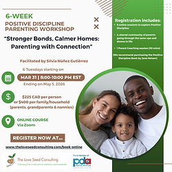 Come and join a safe space where you will connect with other parents going through the same ups and downs in life while learning specific and practical tools that will bring more understanding, respect and love to your home. Together we will explore how to act kind and firm, invite to cooperation, focus on solutions, avoid power struggles, discover the root of children's behavior, understand how the brain works, alternatives to punishment, and much more! Where? 6-weeks online sessions via Zoom. When? Every Tuesday from March 31, 2026 to February 23, 2026 from 8:00-10:00pm EST Investment: $225 CAD per person / $400 per family/household *plus taxes (Upon registration participants will receive: 6 online 2-hr sessions, a free personalized consultation and an opportunity to bond with other parents going through the same ups and downs in life). *** To run the 6-week class series, we require a minimum of 8 participants registered, caping it to a maximum of 20 participants. CLASS CONTENT: CLASS 1: What do you want for your children? Conversations, connection hugs, and tool cards CLASS 2: What is Positive Discipline? Being kind and firm, understanding the brain, and positive time-out CLASS 3: Beliefs behind our children's behavior, sibling rivalry, and the 4Rs of recovery CLASS 4: How do I influence my children’s behavior? Parenting styles, focus on solutions, and family meetings CLASS 5: Connection before correction and the power of encouragement over praise CLASS 6: What is my responsibility? Prioritizing lifestyle and mistakes as learning opportunities